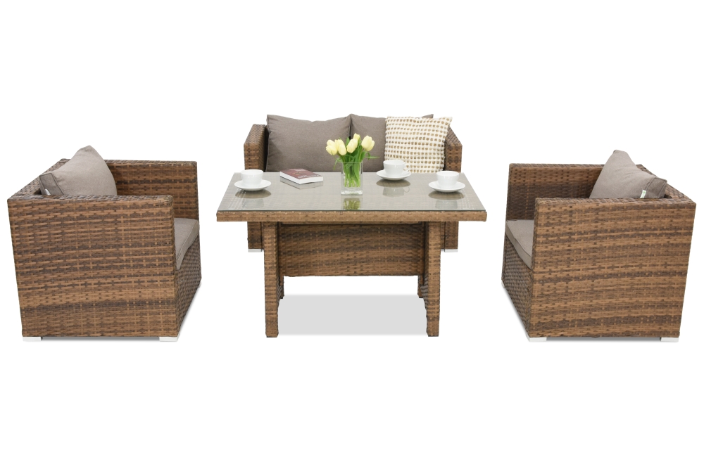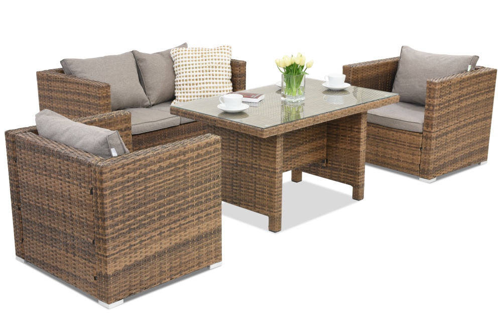 De kleine Roma Apetito set van Garden Point is ontworpen voor vier personen. Er passen meerdere stoelen of een extra bank comfortabel aan de tafel.